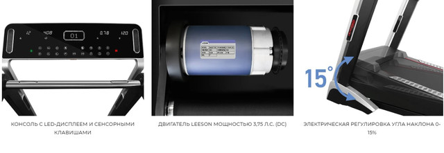 Надежный двигатель, произведенный американской Leeson, выдает 3,75 л.с. в режиме постоянной нагрузки и 6,5 л.с. в пиковой мощности. Износостойкое полотно толщиной 2,2 мм с вплетенными полимерными волокнами рассчитано на самую длительную эксплуатацию. Размер полотна составляет 142*51,5 см, это обеспечивает полную свободу движений на любых скоростях. Динамические характеристики находятся на самом достойном уровне - скорость варьируется от 1 до 20 км/ч, угол наклона изменяется в диапазоне от 0 до 15%. За амортизацию отвечают 2 динамических эластомера VCS коммерческого класса.